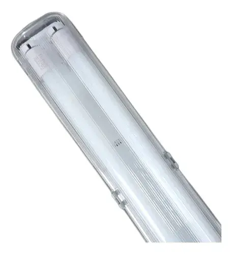 Equipo Estanco ILV diseñado para albergar tubos LED de doble fila de 120CM. Fabricado en policarbonato para ofrecer alta resistencia contra el polvo y la humedad (IP65), ideal para ambientes exigentes como bodegas o estacionamientos.